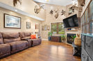 Inside, the family room features a cozy gas fireplace and soaring cathedral ceilings that open into the kitchen for easy, open living.